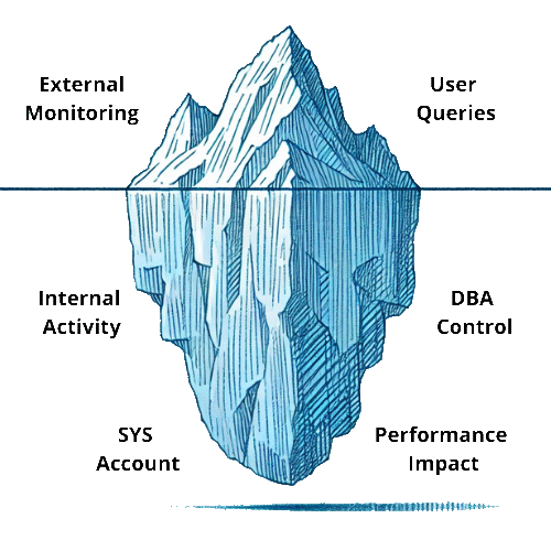 Otra dificultad es la actividad interna de la base de datos. Oracle tiene muchas capacidades que ejecutan actividad internamente y no son visibles desde el exterior, como bloques anónimos PL/SQL a procedimientos, disparadores, programas Java internos y trabajos programados. Algunas tecnologías de captura (específicamente la inspección de paquetes) sólo pueden ver la actividad fuera de la base de datos y no verán las SQL, tablas y columnas de la actividad interna.